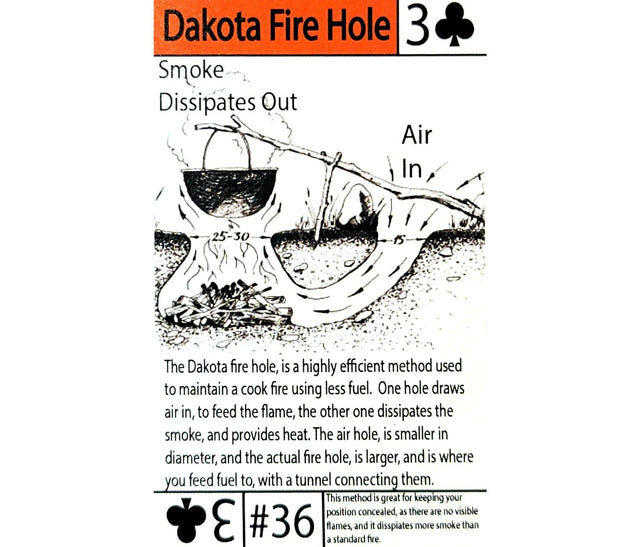 Dakota Fire Pit Construction Tip Card—a credit card-sized informational companion that provides written instructions and visual aids on how to construct a Dakota fire pit, also known as a Dakota fire hole. With clear instructions and concise illustrations, this tip card empowers you to create an efficient campfire that maximizes fuel utilization and minimizes smoke. Whether you're a seasoned camper, a survivalist, or simply seeking to enhance your outdoor skills, our tip card is your ultimate guide to mastering the art of the campfire.