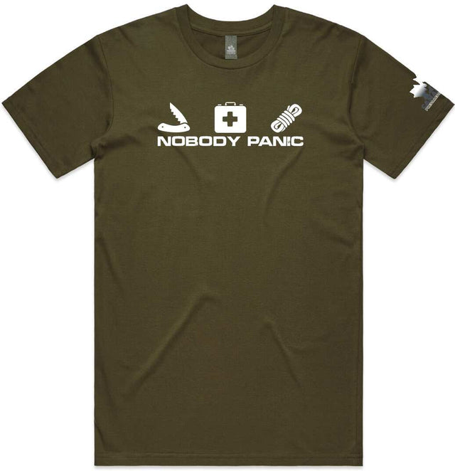 Men's Nobody Panic T-Shirt - Safari / Small is backordered and will ship as soon as it is back in stock.
