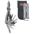 locking Philips screwdriver, locking heavy-duty saw blade, locking dual edge knife blade, locking large flat screwdriver, fine flat head screwdriver, needle nose pliers, regular pliers, wire cutter, leather bore, scraping blade, wire strippers, cap lifter, can opener, metal file, scribe, awl, vise, lanyard attachment |