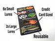 Grim's Lure Card was designed to be a low weight, highly efficient space saving lure set. This card comes with several lures in various shapes, sizes, and colors, and all stored perfectly flat, in a housing system the size of a standard credit card. This Lure Card has been used in the frigid waters of the Canadian Rockies, all the way to the 100+ degree temperatures found far to the south in Texas. Grim's lure card has caught fish both large and small, and is the perfect addition to any camping, hiking, or survival fishing kit, or just to keep a few on hand as backup lures for your regular fishing kit. as with all of our tools with removable parts, Grim's Lure Card is reusable, thanks to our custom designed tool retention system.