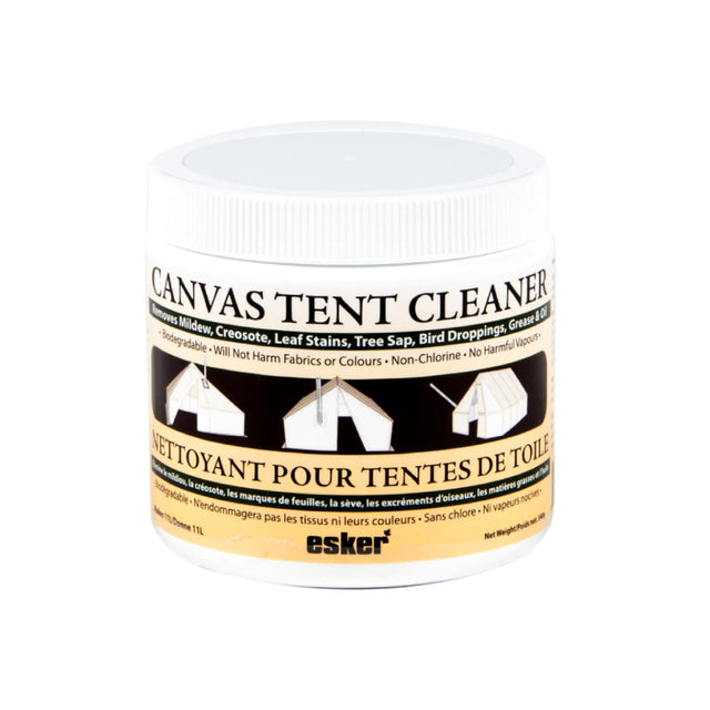 Esker's Canvas Tent Cleaner is a non-toxic, non-chlorinated cleaning solution to mildew, creosote and other stains on cotton canvas. Just add to water. Colour safe. Gentle on skin. One container makes 11 litres of cleaner. One litre of solution covers 3.5 square metres.