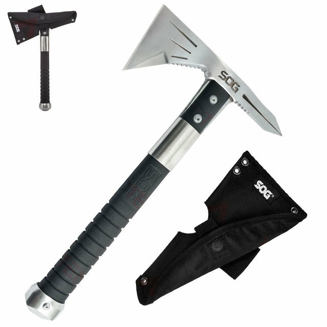 The original SOG Voodoo Hawk was designed as a combination of our tactical Tomahawk and FastHawk. This Voodoo Hawk Mini is smaller and lighter while featuring the same components; an extended cutting head, spike for piercing applications, compact glass-reinforced nylon handle, and metal pommel cap. The Voodoo Hawk Mini has everything the Voodoo Hawk has but in a smaller, compact form making it great for outdoor travelers like backpackers, hikers, hunters, or paddlers. The durable glass-reinforced nylon handle can take a beating while still remaining strong. Great tool for anything you can throw at it. Includes Nylon carry sheath.